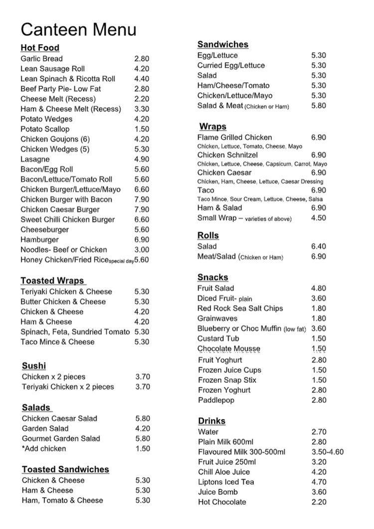 The Dungog High School canteen is open Monday-Friday from 8:30am - 9:00am for breakfast and is also open during recess and lunch.